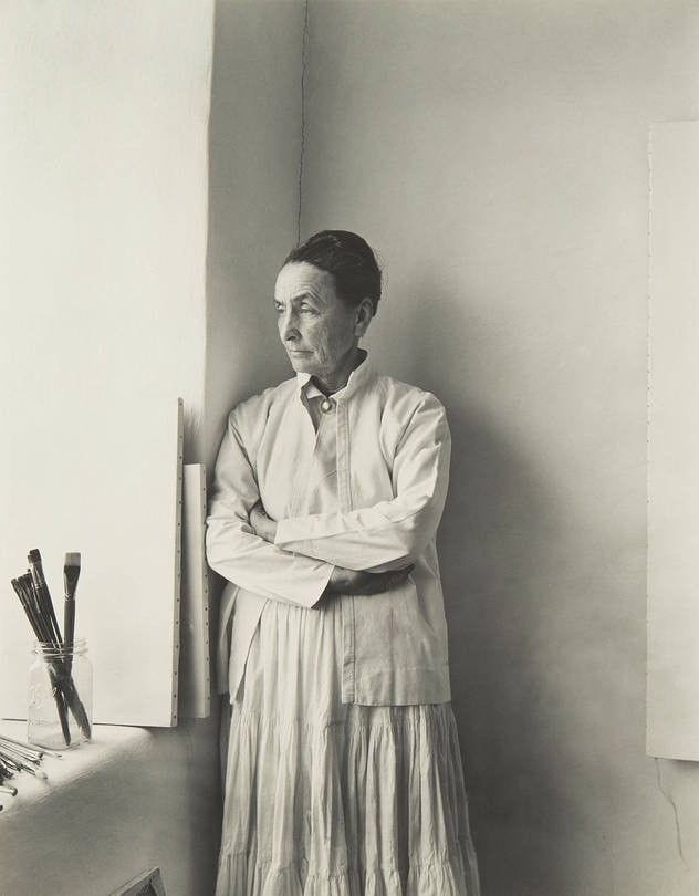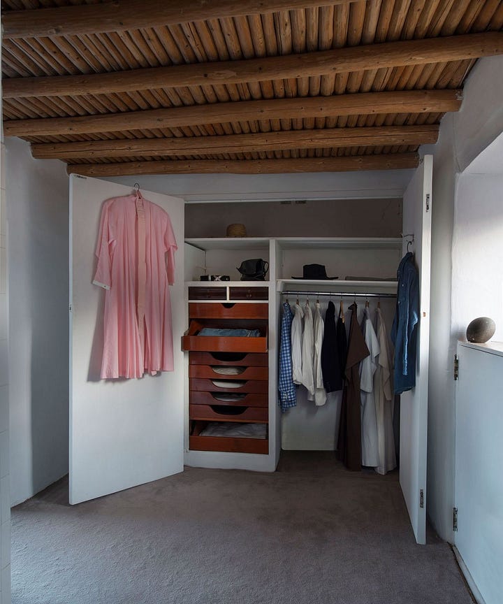 O’Keeffe’s attention to the details of daily life extended beyond the garden and studio to the way she dressed and arranged her home. Her wardrobe was famously minimal and deliberate: custom wrap dresses in muted colors, carefully selected so that each piece could be worn again and again, allowing her freedom to focus on her work. In photographs of her Abiquiú home, her closets and living spaces reflect the same clarity and restraint as her paintings - ordered, purposeful, and full of subtle beauty. Every object, from her furniture to her clothing, was chosen with intention, a quiet reminder that aesthetic care can permeate all aspects of life, not just the act of making art.